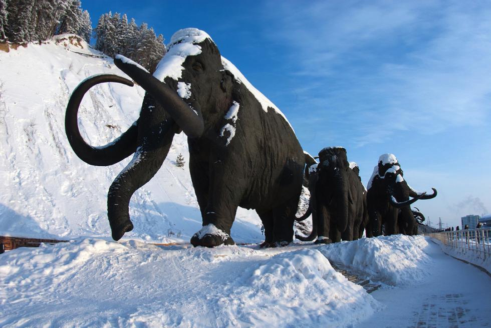 历史上这里曾是猛犸象的栖息地,如今只有被白雪覆盖的青铜雕塑才能让人想起它们。这里是西伯利亚的中心地区,秋季气温就已经开始骤降,并且原始森林也是白雪皑皑,实际上冬季就已经到来了。